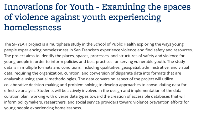 Research Partner Organizations (both in the Berkeley community and in the broader community), faculty, and graduate students can all assist in making research accessible to students. Social Impact efforts with non-profit community groups offer the opportunity to help address critical community issues.